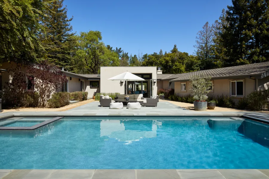 Ranch-style home on a flat, sunny acre remodeled with designer elements to create an effortless indoor/outdoor lifestyle. The floor plan is organized around a lovely central courtyard with the living room, dining room, and kitchen opening to the outdoor space which features a built-in Wolf gas grill and a pizza oven. The modern kitchen is outfitted with an Arclinea high-end Italian cabinetry system, professional-grade appliances, and quartz countertops. The spacious primary suite includes a large walk-in-closet, luxurious bathroom with whirlpool tub and makeup vanity, and a sitting area that opens to a lovely private garden. Four additional bedrooms all include closets with custom storage systems. Additional amenities include a family room, library, office, temperature-controlled wine room, and laundry room. The yard offers many seating options for entertaining and incorporates a pool, spa, gas fire pit, greenhouse, barn, horse paddock, and mature redwood, fruit, and oak trees