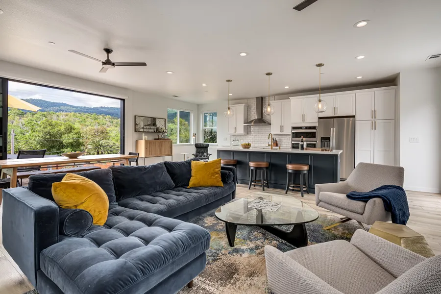 This contemporary home will delight you with a flowing, open floor plan surrounded by landscaped gardens, picture windows with views throughout, on-trend fixtures and finishes and a serene palette. Well designed, the home features lovely outlooks and room to play and entertain on apx. 1 acre with additional room for a pool, pool house, orchards and vines. Lighted, spacious entertaining patio boasts spa, dining and lounging areas + an Ipe deck accessed via dining room stacking sliding door - what a view! Modern, energy efficient/net zero construction: 6.6KW Tesla solar roof and powerwall. You'll love the electronic shades, picture windows in every room, remote fireplace, massive prep/dining island, wine refrigerator, modern fixtures and finishes, ample walls for art. Not in the current vacation rental exclusion zone; new owner must apply. Located aside the town of Glen Ellen near all wine country has to offer, apx. 1+ hour from San Francisco.