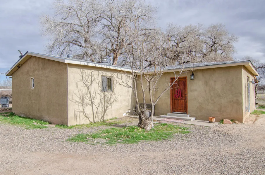 Beautiful country setting, fabulous 1.26 acres, large cottonwood trees and plenty of room for your horses. Property is waiting for those animals with a large barn, stalls, fully fenced and cross fenced. Real country ambience with wood flooring in kitchen. Anderson windows & refrigerated air conditioning. 2-car detached garage with extra storage space or workshop area. Two wells & RV hook-ups. Easy access to I-25 and minutes to Albuquerque.