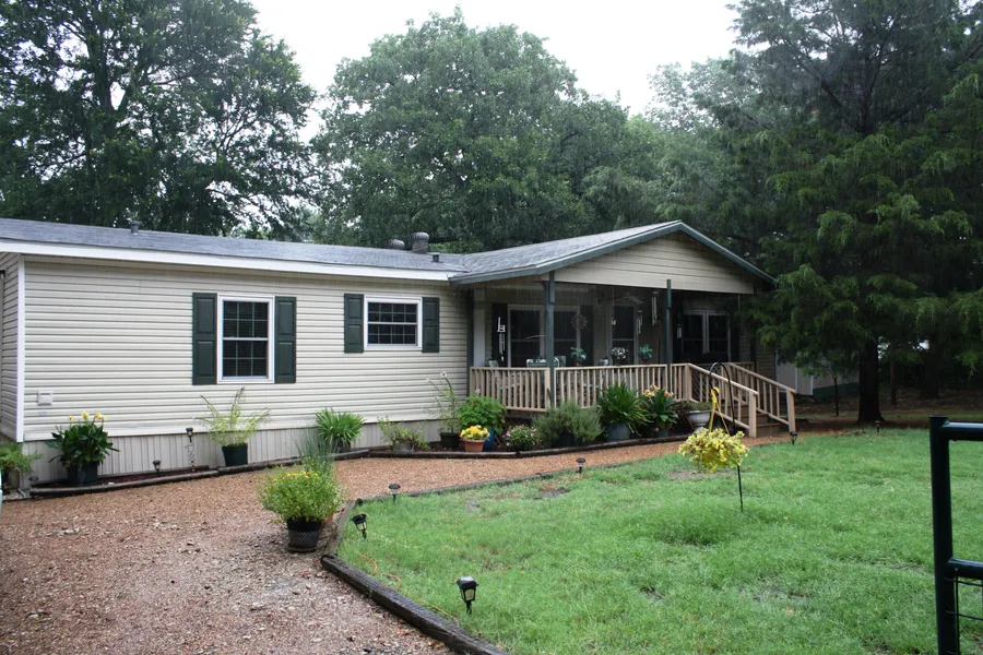 A tree -filled landscape is the backdrop for this well-maintained 3 bdr, 2 bath doublewide mobile home on one acre. The covered front porch invites you into the open floor plan with the dining area & living room as one large space. WBFP has gas logs for convenience.Large kitchen with room for an island,lots of cabinets & a breakfast area.Master suite has adjoining bath with separate vanities,shower & deep tub, plus 2 walk in closets. 2nd & 3rd bdrs share a hall bathroom.Windows updated in 2010. Central heat & air, all electric. 1 stall carport with lawn mower storage, separate storage bldg. Yard is completely chain link fenced with auto gate opener. WPISD. Macbee Water Supply,Trinity Valley Electric.