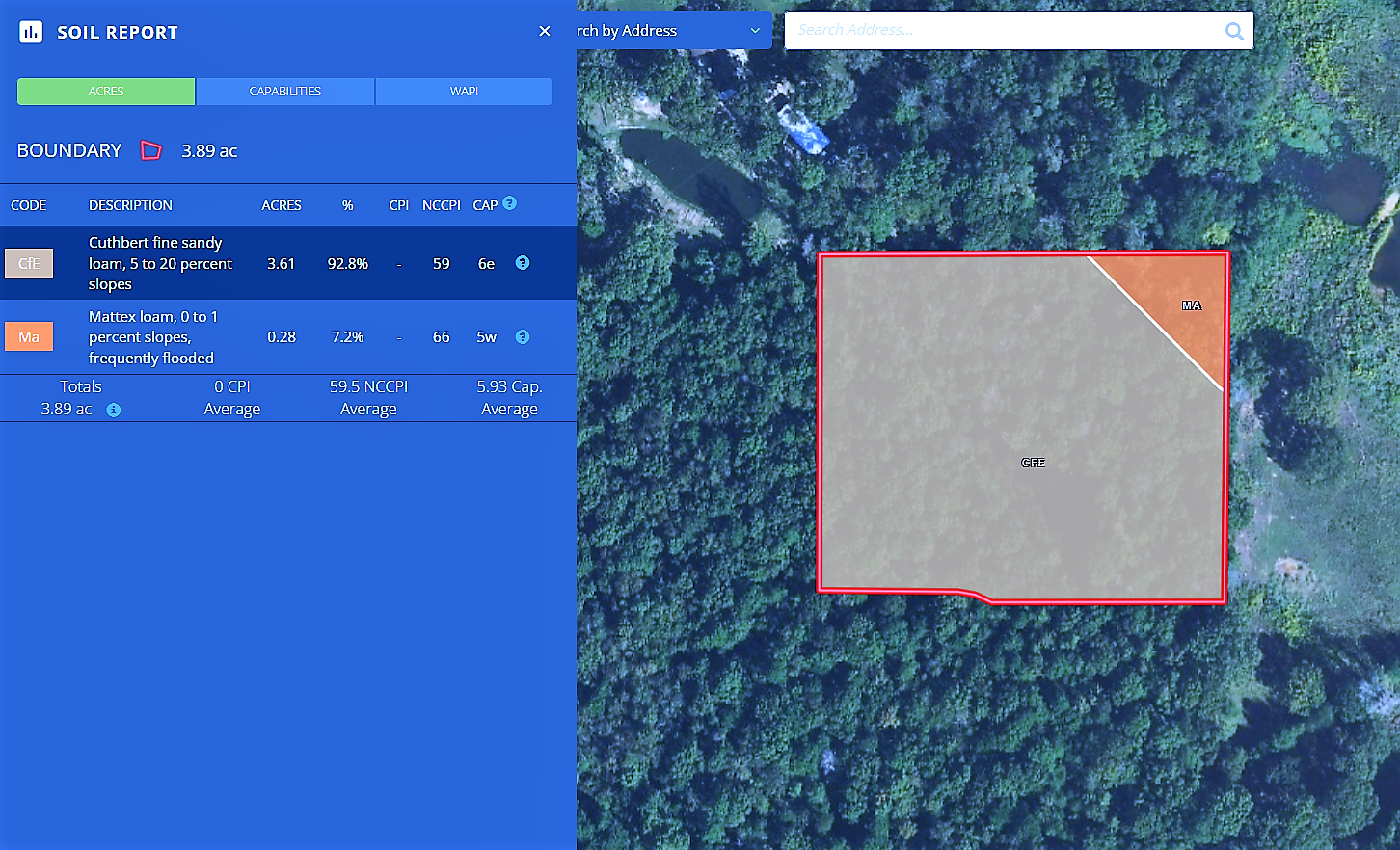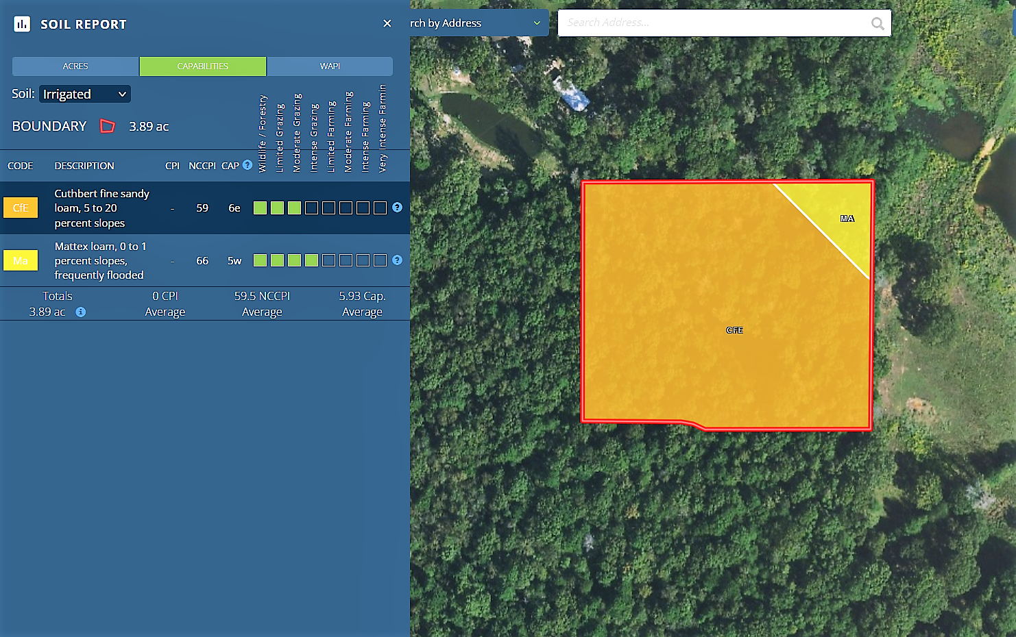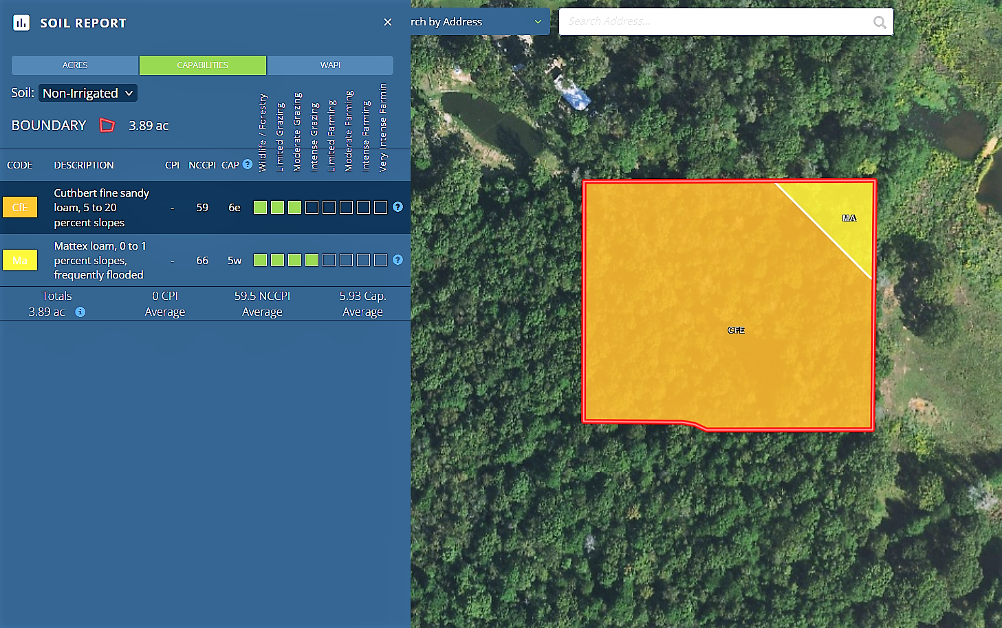 Power lines run to the west of the property. A water line runs along County Road 413 with several of the neighbors running their own lines down Turner Circle for access. Well Depths in the area are reasonable with tracts directly to the south drawing 20 Gallons/Minute at average depths of 180 feet. Soil Type is primarily composed of Oakwood Fine Sandy Loam (OkB) which provides for very little slopeage (1 5%) and stability for septic installations.