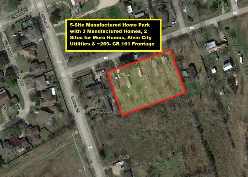 Highly Desired Rental Investment Property. 5-Site Manufactured Home Park on 1.19 Acres has 3 Single-Wide 3/2 Manufactured Homes (Built in 2002/2003/2005), 2 Extra Sites for 2 More Single-Wide Manufactured Homes, Alvin City Utilities & ~269 Feet CR 161 Road Frontage. Each Single-Wide Manufactured Home is 1008 sqft with 3 Bedrooms & 2 Bathrooms for a total of 3024 SqFt. Current Rental Income: 3 Manufactured Homes have Leases for $650/month per home, One Site has Lease for $300/month & the Other Site has Lease for $250/month. Tenants are required to maintain lawns/pay utilities. Property is located Just Minutes to Alvin Schools/Community College/Parks/Fire Dept/Police Dept, TX-35, TX-6 & Proposed TX-99/Grand Parkway (See maps). TX-99 (Houston's 3rd Loop) will connect Alvin-Rosharon-Katy-Woodlands-Baytown-League City when done. Only 14 Miles to TX-288 & I-45; 20 miles to Hobby Airport, Colle...