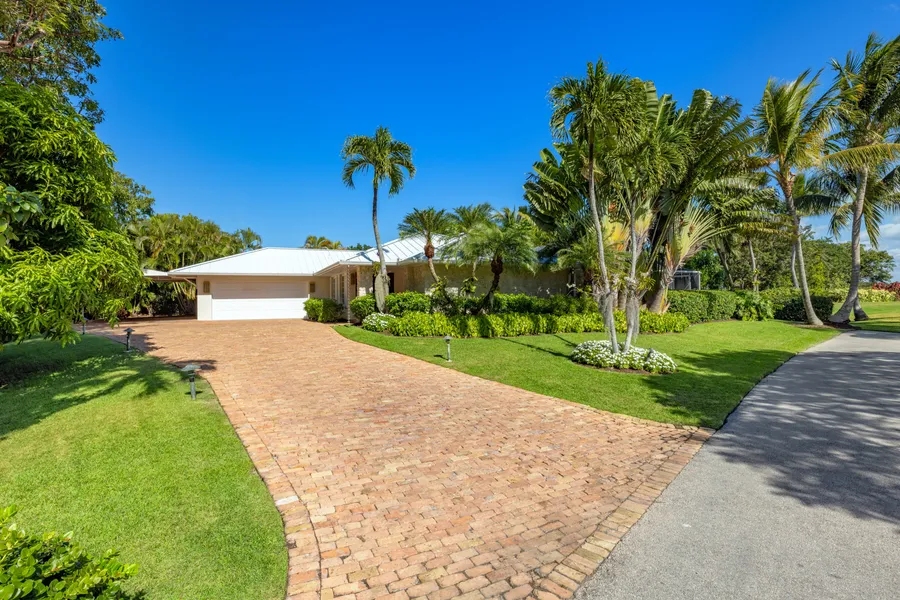 As you approach this all-on-one level home you will understand the uniqueness of this location situated at the end of the street overlooking the 17th fairway of the Dolphin Course. The privacy is unmatched, tucked away with long fairway views. Enjoy sitting outside in a tropical paradise among coconut palms, a key lime tree, banana stands, mango and avocado trees. The landscaping offers Zoysia grass, keystone walkways with river rocks, along with stunning landscape lighting. This three bedroom and three bath home has been tastefully renovated offering stone floors throughout, custom cabinetry, Taj Mahal quarzite in all baths, crown molding, impact windows and doors, raised seam white metal roof, a Generac whole house fully automatic generator with 1000 gallon propane tank and gas tankless water heater. The kitchen is a chef's dream come true with a Viking dual fuel range, Subzero refrigerator, Thermador dishwasher, 42" upper custom wood cabinetry with under counter lighting and granite counters and backsplash. The outdoor patio offers a Shellstone surface both in the pool patio area as well as the outdoor seating area surrounding the live orchids in the trees....a perfect sight for outdoor grilling.