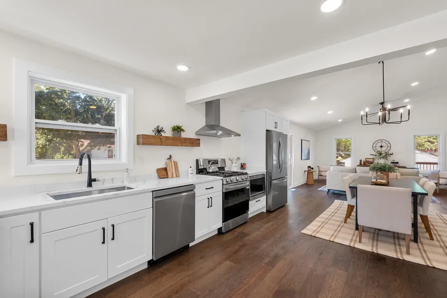 Steps away from historic Brick Street, this 5-bed, 3-bath home blends modern comfort with everyday function. The open main floor features a bright kitchen with gas range, oversized island, and dining area that flows to a spacious living room and large private deck--ideal for entertaining. The primary suite offers a walk-in tile shower, double vanity, and generous closet. Two more bedrooms and a full bath complete the main level. Downstairs adds a guest suite, laundry, and storage. Upstairs, a finished bonus room serves as a fifth bedroom or office. Corner lot, fenced yard, 2-car garage, and a quiet location near schools, parks, and downtown Delavan.