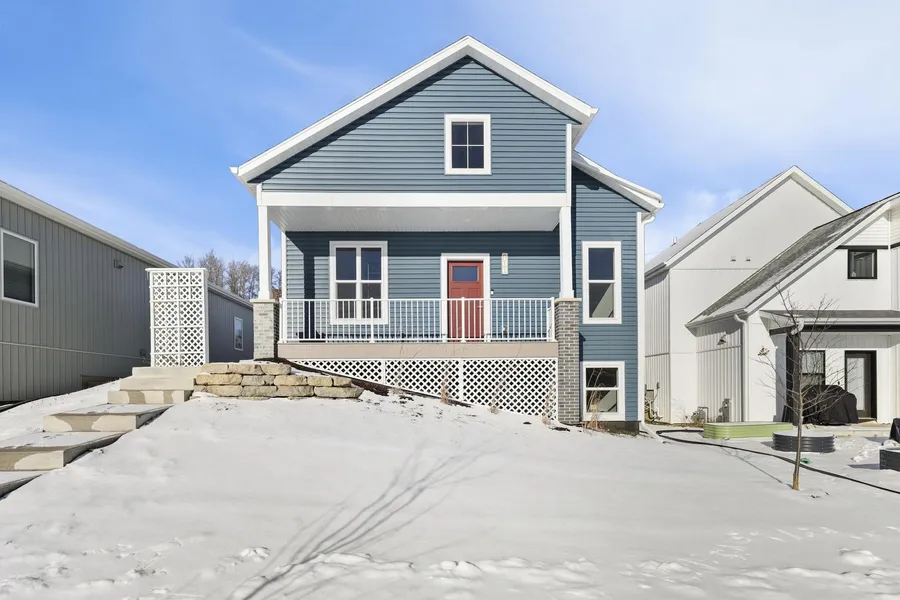 Thoughtfully designed and Focus on Energy Certified, this home blends classic four-square architecture with modern efficiency and forward-thinking upgrades. A welcoming front porch and private entrance garden framed by a custom arbor trellis set the tone for what awaits inside. The open-concept kitchen and living area is anchored by a large island, Quartz countertops, stainless steel LG appliances, and a generous walk-in pantry designed for everyday ease. The main level offers two bedrooms, including a private primary suite with a walk-in closet. The finished lower level adds a third bedroom, full bathroom, and a recreation room wired for audio. Energy-conscious features include LED lighting, a high-efficiency heating and cooling system, and energy-saving appliances. Pre-wired for solar pa