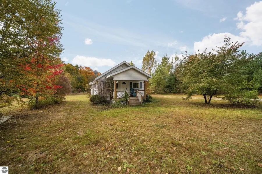Charming 2 bedroom 1 bath home on a private 1 acre setting in Kalkaska. Enjoy peaceful surroundings from the covered front porch and the convenience of a storage shed. Inside you will find hardwood floors complemented by updated vinyl plank flooring, fresh paint, and an updated bathroom featuring a newer vanity with double sinks and solid surface countertops. The spacious kitchen offers solid surface counters and opens nicely to the dining and living areas creating a warm and inviting space to gather. All appliances are included making this home truly move in ready and full of charm.
