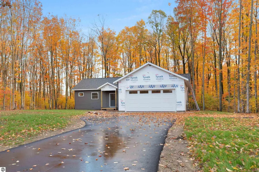 Tucked away on a large 1.22 acre corner lot surrounded by mature trees for privacy, you will find this brand-new home in the well established neighborhood of Country Side Estates just located south of Traverse City and only minutes away from all the great amenities this area has to offer. The open floor plan features luxury vinyl flooring throughout, soft-close cabinetry with granite countertops in the kitchen and bathrooms, a pantry, mudroom, tray ceiling in the living room and thoughtfully placed transom windows throughout. The kitchen, living room and dining area overlook the private, partially fenced backyard, walking out to the 12x12 maintenance free composite deck will make entertaining a breeze. The primary suite is located on one side of the home with a large walk-in closet, the ensuite features double vanity sinks, quartz countertops, a water closet, and tiled shower. On the other side of the home you'll find 2 more bedrooms and another full bath. The 24x24 garage has a 200 amp service to accommodate an electric vehicle charger. Full basement with egress windows and plumbed for a 3rd bath, with a fiberglass shower already installed for additional living space in the future. To be complete November 2025.