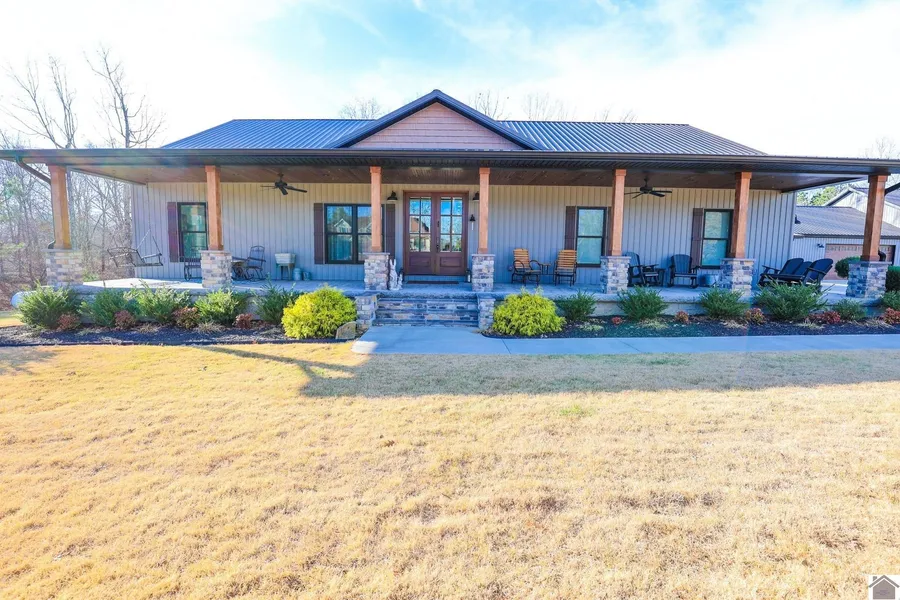 Built in 2021 and located just 2.5 miles from the public boat ramp, this beautiful home offers modern design and thoughtful details throughout. The open floor plan features a spacious kitchen with a stunning island, a large picture window that fills the space with natural light, and easy flow into the oversized living room with a fireplace and custom built-ins. The primary suite is truly a retreat, with an oversized bedroom, a spa-like bathroom featuring a soaking tub and a large tiled shower with multiple shower heads, and a walk-in closet that connects directly to the laundry room for added convenience. Enjoy covered porches on both the front and back of the home, plus a safe room located just off the back porch. The detached garage includes a fully equipped apartment, perfect for guests, an in-law suite, or potential rental income. This home offers comfort, flexibility, and a great lo...