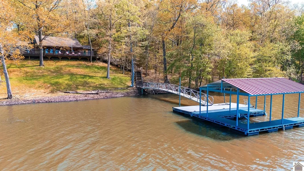 Secluded, Kentucky Lake waterfront cabin style home with outstanding views on 4.68 acres! Home has many updates including, new flooring installed throughout in 2024, newly renovated kitchen and bathrooms, 2022 heat and air updated to individual controlled climate controlled rooms. Home also features a custom tulip poplar wood doors, framing of windows, and vaulted ceiling. Also, covered boat slip with attached dock and composite decking on back of home and fiber optic for internet. In 2005 home was remolded down to the studs including the exterior tulip poplar siding which was added to the entire home! One will have a great time fishing or swimming off the covered dock area and the gentle sloping steps to the water will make for ease of getting on your boat and heading out for the day!