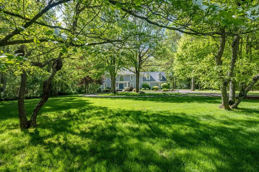 Unique White Pine Lane, where individual lots are multi acre and next to Guilford Land Trust and E. River Preserve acreage and trail systems. This large bright colonial offers every dedicated space you could hope for - 4,141 sf not counting a finished lower level with full bath (950 sf) for guest overflow or other activities. A gracious approach includes a circular drive. Entering through the front door you are met by a sunny double story foyer with curved staircase up. On the main level a formal dining room with paneled walls and detailed inlay wood floors leads to the kitchen, open to a breakfast room and just steps to the newly done patio. Past the breakfast room, a very inviting family room complete with fireplace flanked by custom built-ins. A front facing living room completes the main level living spaces. Up the curved stairway to a remarkable primary bedroom suite with roomy full...