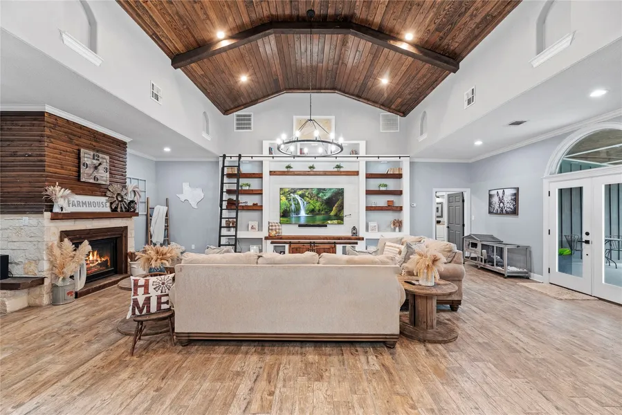 Motivated Seller! This charming property is a must-see! Recently remodeled inside and out, this home sits on just over 10 beautiful acres with a beachfront pond. The barn has 6 stalls, with room for 8, and there is ample parking including a 3-car covered area (23x30) and an oversized building that can serve as a garage or shop (40x42). Updated chicken coop and goat shed add to the rustic country charm. Inside, you'll find barn-style doors, a spacious primary bathroom with a large shower and double sinks, and an oversized primary bedroom with updated carpeting and an electric fireplace. The open concept living and eat-in kitchen are perfect for entertaining, fireplace and custom built-in bookshelf with rolling library ladder. Office ( or whatever you want to use it for) has been updated with half bathroom and adjoining covered pavilion. There are 2 power meters on the property.