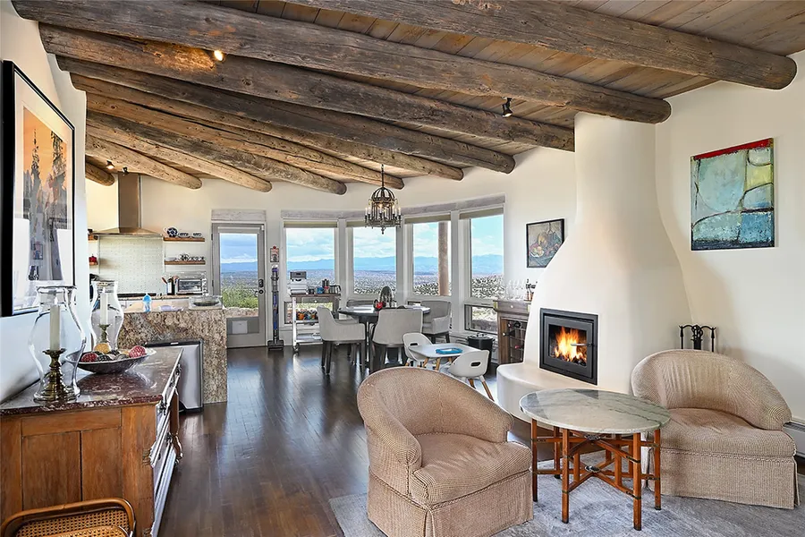 This is a rare opportunity to own a remarkable three-bedroom, three-bath Pueblo-style home with spectacular views in Tesuque. A complete renovation in 2015 tastefully blended original adobe aesthetic with a wonderful modern sensibility. Saltillo tile and hardwood flooring, vigas, nichos, and custom wrought-iron railings and balusters can be found throughout. An expansive contemporary kitchen and dining area with elegant wood cabinetry and a honed-granite island is wrapped in windows that capture views in multiple directions. The owner’s suite has a sitting area, a walk-in closet with built-in dressers and shelving, laundry facilities, Jemez Mountain views, and a bath with a custom-crafted dual vanity, heated tile flooring, and a glass-walled shower with views of the world-renowned Santa Fe Opera. Patios, a pergola, an outdoor kiva fireplace, a masonry gas fire pit, and a grilling area encourage alfresco lounging, dining, and entertaining. The separate studio could also serve as a library or office. Other highlights include a wine cellar, a media room with surround sound, built-in speakers inside and out, an irrigation system controllable via mobile app, a whole-house water softener, a fully insulated kennel with air conditioning, and a two-car garage. An additional vacant lot is included in the purchase price. The superb location is less than a mile from the Four Seasons Resort, near Tesuque Village Market, and a short drive from both the historic Plaza and the opera.