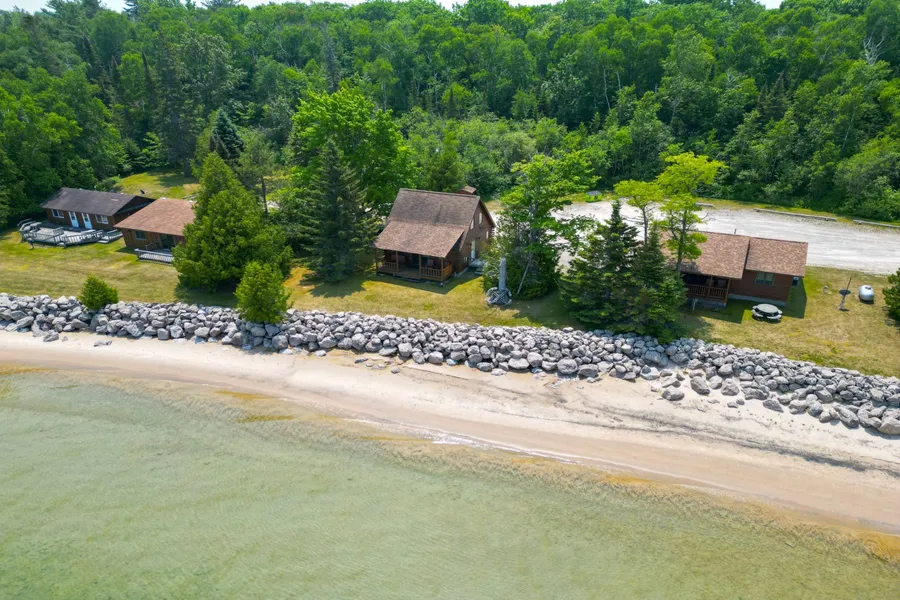 Secluded Luxury with 600 Feet of Sandy Beachfront on 10+ pristine acres! Introducing the Majestic Manitou Beach Property on Lake Huron: Secluded Luxury. Welcome to a truly exceptional property nestled along the pristine shores of Lake Huron in Michigan. This exquisite retreat offers an incredible 600 feet of private, sandy beachfront, providing a breathtaking oasis of relaxation and tranquility. If you are searching for the perfect blend of privacy and natural beauty, look no further. The centerpiece of this remarkable estate is the collection of three cedar log cabin-style structures, each meticulously designed and fully finished to offer detached living spaces that epitomize comfort and charm. Each unit features 2 bedrooms, 4 beds, a full bathroom, and rustic elegance with knotty pine walls. Cozy up by the fireplace or enjoy a meal in the complete kitchen. Vinyl floors, commercial-grade carpeting, and forced AC units provide comfort. Wake up to charming interiors bathed in natural light, leading to a covered porch with stunning lake views. This heavenly location also features additional structures that enhance the convenience and functionality of the property. A 2-bedroom 1 bathroom ranch house with an added check-in office sits alongside yet another two-unit ranch efficiency structure that offers even more versatility, with each unit featuring a bedroom, kitchenette, living room, and full bath. The south side of the property also consists of a 4500 sq ft pole barn with heated workshop and office, a large storage area, as well as additional ample storage rooms. The 10.02-acre property offers seclusion and a haven of privacy. Immerse yourself in natural beauty, breathtaking views, and luxury. Own a piece of paradise. Come make an appointment to tour this property and its fine amenities. Pre-approval letters are required. Appointments must be accompanied by listing Realtors, notice is needed. Measurements are approximate. BATVAI
