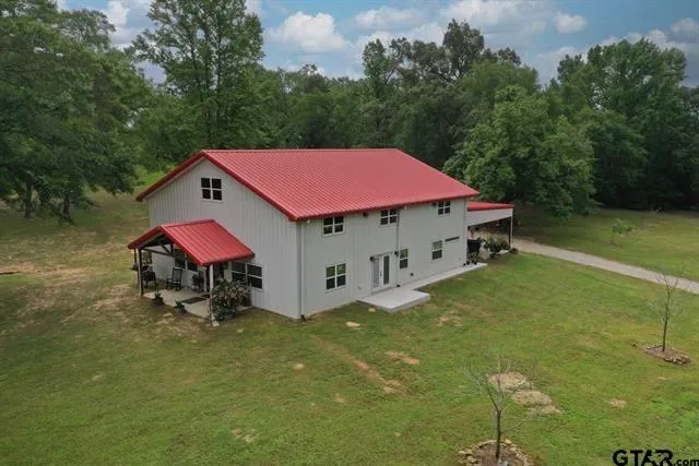 Discover the ultimate blend of country serenity and modern comfort with this dream gated property in Arp, Texas—featuring two homes nestled on over 10 picturesque acres. The main residence is a custom-built barndominium set far off the road, offering privacy and over 3,700 square feet of thoughtfully designed living space. The main level boasts a spacious laundry room and half bath, along with a luxurious owner’s suite. The suite includes a sprawling bathroom with double vanities, a soaking tub, a walk-in shower, a private water closet, and access to a massive walk-in closet. The heart of the home is an open-concept living area centered around a striking fireplace and seamlessly flowing into the dining area and gourmetkitchen. The kitchen features an island, stainless steel appliances, and a stunning butler’s pantry that elevates both function and style. Also downstairs is a guest bedroom and an additional full bath with a walk-in shower. Upstairs, you’ll find three more bedrooms—one currently used as a craft room—and another full bathroom with hookups for a second washer and dryer. The second residence, located at the back of the property, offers 2 bedrooms, 1.5 baths, and an open-concept living space with picturesque views from every window. Attached is a spacious 20' x 40' shop, ideal for storage or hobby use. This secondary home is currently income-producing through a furnished rental platform and can continue as such if desired. There is also an RV hook up! All this is just 20 minutes from the hospital district in Tyler, giving you the perfect balance of country tranquility and city convenience. This is more than a home—it’s a lifestyle.