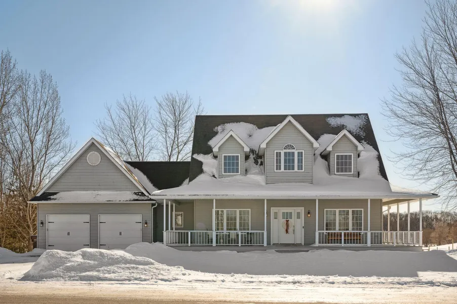 Only available due to relocation, this charming modern farmhouse with gorgeous views has a wrap around porch, 30x60 pole barn/shed (with electric and in floor heat ready), lean-to (with lighting), and a heated chicken coup complete with 13 chickens! Main floor primary bedroom suite (walk-in closet, dual sinks and separate tub/shower) with 2 generous equal bedrooms on the 2nd level and a lower level bedroom (being used as an office). Lower level is a walk out with a new stunning bathroom and in floor heat. Spacious family room with a projector and wet bar for movie night! Ceilings have been scraped, updated paint, hardware, light fixtures and trim! The 10 acre property includes a pond you can actually duck hunt on! It is truly an idyllic setting!