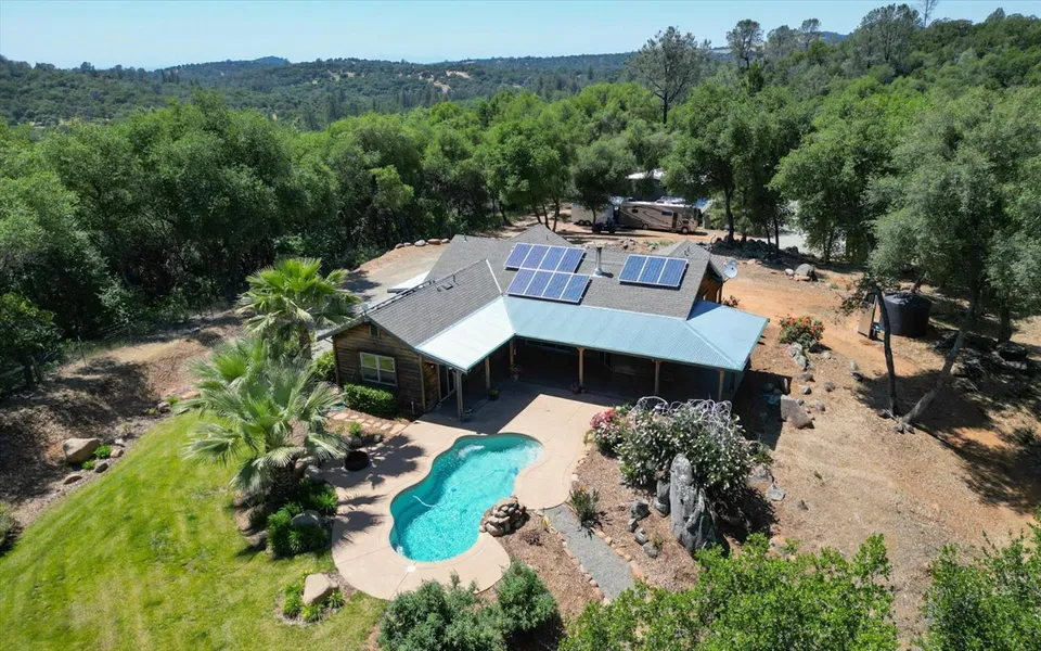 Absolutely charming one story contemporary home on 10 acres overlooking an inground swimming pool and a 5000 s. f. amazing shop in Grass Valley! Rare and unusual to find such an adorable home with vaulted knotty pine ceilings, concrete counters and a delightful open floor plan! Large bi-fold French doors open completely to the covered patio that lead out to the wonderful 15X30 inground swimming pool with views from every angle! Built with 2X6 construction, this energy efficient home has high efficiency HVAC, Aragon gas windows and additional insulation in the attic! The wrap around porch allows the light in without the heat and makes for delightful sitting areas! Alderwood cabinets, tile floors and heated floors in the bathroom. The 5000 s. f. SHOP has heat and air, bathroom with water and roll up doors, plus a mezzanine above. Perfect for an ADU in the upper level and this would be idea...