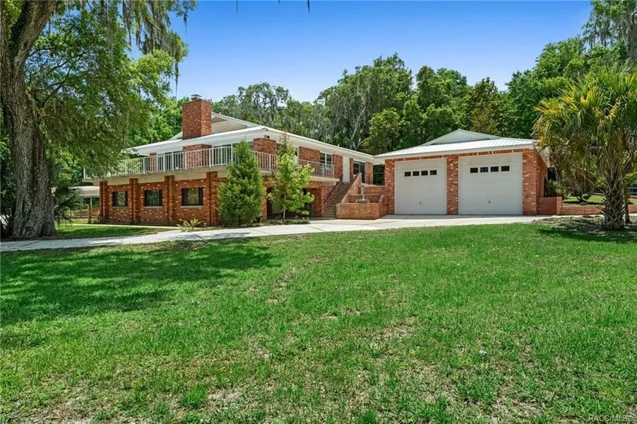 Built in 1975 this unique home is situated on 10.12 park like acres with a 4.95 acre private pond and access to Little Lake. Two story "tree house" has 2,808 sq ft of living space to include a basement. Upper-level features 2 bedrooms, 2.5 baths and an open space living area with kitchen, dining and great room featuring a wood burning fireplace. Four sets of sliders give you access to the wraparound balcony where you can enjoy incredible views of the private pond and grand oak trees. The den can be used as a second living area or would make a wonderful home office! Master suite has his and her closets, ensuite bath with shower/tub combo, and sliding doors leading out onto the screened lanai with inground heated pool. Access the basement down the circular stairway to the massive laundry room/mudroom/mechanical room and an additional room with full bath that has endless possibilities. Leaving the main home, you walk out onto the covered parking area and across to the 35x13 workshop. Detached 30x40 garage with oversized RV garage doors has enough storage for all your vehicles! Additional storage and parking includes covered carports and sheds for all your garden tools and toys! Property has a well, 2 septic systems, public water connection to the house with Floral City Water Association, metal roof installed in 2016, and HVAC in 2014. Your very own pond features a double boat house/dock and ramp to launch kayaks. This property is a truly a piece of paradise!