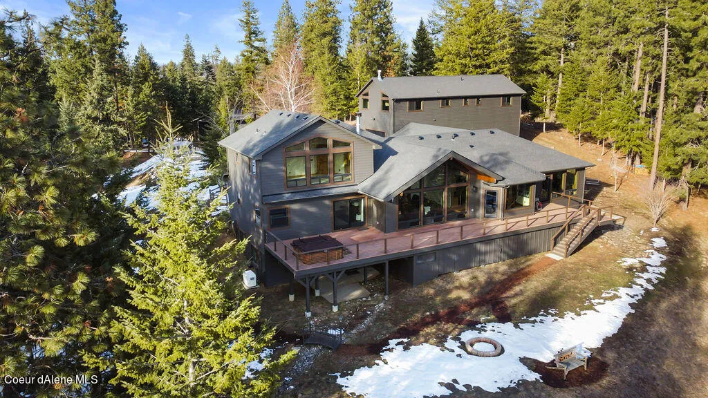 Newly updated Modern Rustic style home on 10.12 wooded acres with LAKE VIEWS located less than 10 minutes to Coeur d'Alene! There is a 4124 sq. ft. MAIN HOME with 3+car attached garage, 1500 sq. ft. GUEST HOME, 25x60 SHOP, and a POLE BARN to park your toys and equipment. This 4124 sq. ft., 4 bd, 3.5 bath home has a gourmet kitchen with high-end appliances, amazing library/music room/or home office, vaulted ceilings, and a beautiful fireplace in the great room with a wall of windows that capture the natural light and brings the beauty of the outdoors in! The primary bedroom is on the main floor with an amazing bath and closet update, jack and jill bedrooms upstairs, and a complete rec room and bathroom in the basement. Above the shop is a cozy 1500 sq. ft. 3 bed, 2 bath guest quarters with a wonderful fireplace, tongue and groove ceilings, and knotty alder cabinets and trim, plus its own deck for enjoying the scenery! There is a 17kw generator and 2 1000-gal underground propane tanks.