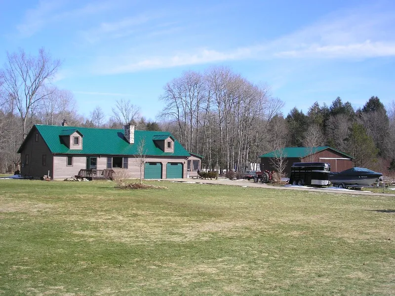 Country Seclusion 4 Bedroom, 2 bath vinyl sided Cape Cod with inviting floor to ceiling stone fireplace, screened porch, open rear deck, 2 supplemental wood burners, full basement with finished hobby room, newer metal roof, 2-car attached garage, barn with 4 horse stalls, and newer 30x40 pole building. Located on 10.21 acres with stocked pond. MLS 97816
