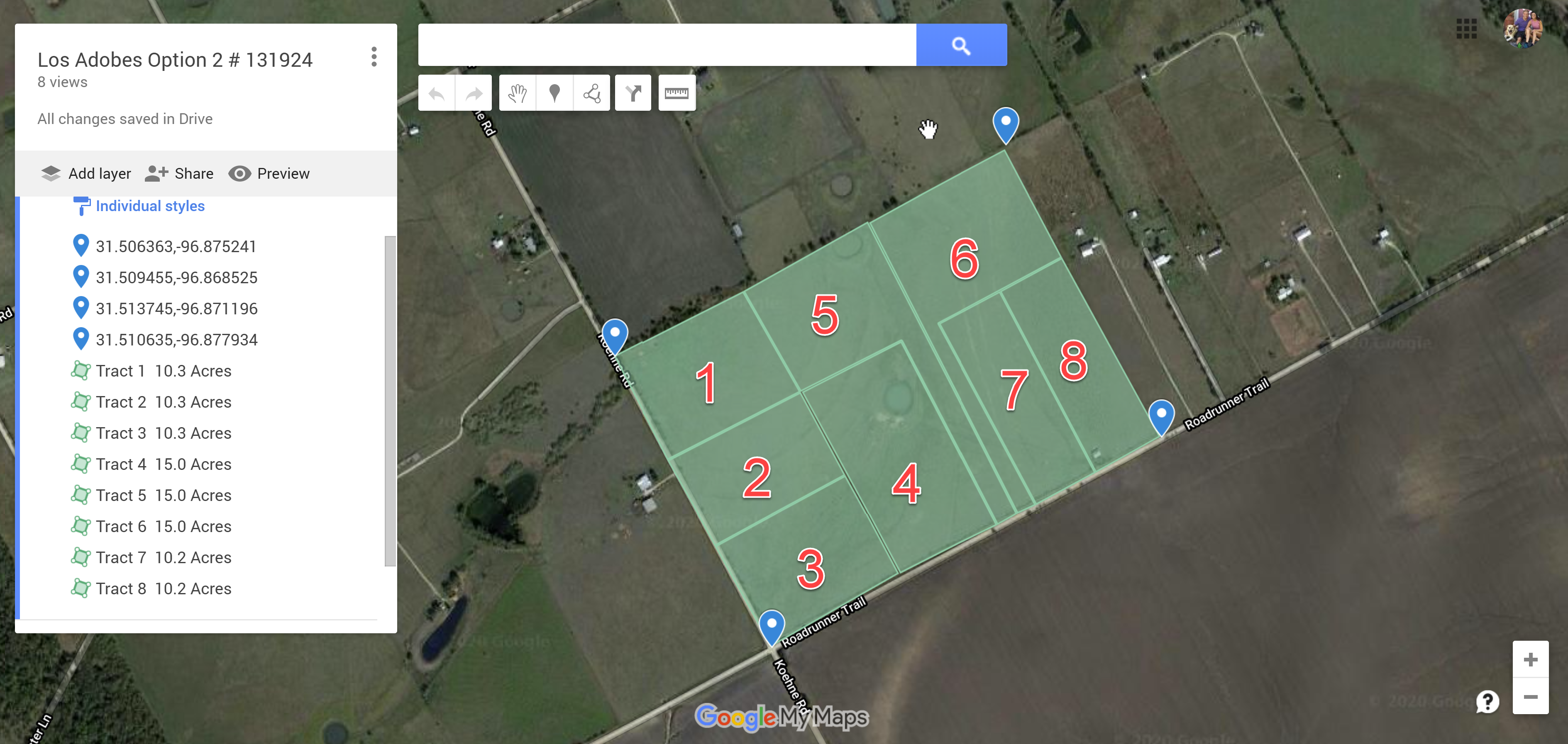 Research Parcel InformationSearch 31.50846, -96.8766 in Google Maps for Directions to the property. This property has been corner-staked and line-staked making identification of the property outline easy to see. Copies of the Survey Plat Map are available upon request.