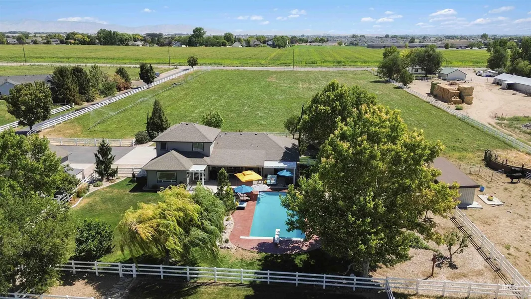 Amazing 10 acre estate located 550 feet down a private paved lane. White vinyl fencing in several pastures. Barb wire in the rear. 3 separate pastures, the front is about 4.5 acres, the rear is about 4.5. There is a small pasture by the shop/ADU. The small barn has auto water for animals and the property is great for rotating horses/cows etc. 4 bedroom completely updated home with most of the square footage on the main level. 3 bed/1 bath upstairs. Main level has master suite with his/hers closets, his/hers vanities, heated floors, large walk in shower. Bedroom has a corner gas fireplace and glass doors to the patio. Den right off the entry with great views of Bogus. Large entertaining kitchen with white custom cabinets to ceilings, Wolf and Subzero, Zephyr beverage fridge and Bosch appliances included. Cozy family room with corner gas fireplace. Garage and detached garage both have epoxy flooring & custom cabinets. Large rear patio with 20x40 inground pool w/auto cover. Vego garden beds, chicken run, storage shed area, fruit trees & berries. ADU can come furnished with an acceptable offer. Just 19 minutes to the Boise airport & 9 minutes to I84. Close to the new Costco & Winco.