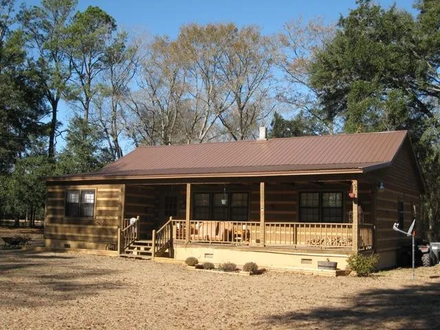 Experience country living less than 10 minutes from town. Three bedroom log cabin with plenty of room for horses,a barn or even another residence. The log cabin features exposed beams, large central stone fireplace and large porches on the front and back of the home. With live oaks, and a 3/4 acre fishing pond this property must be seen to be fully appreciated.