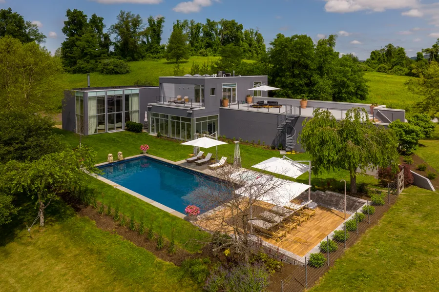 Hillsdale House is a 4 BR/4.5 BA, Modernist home beautifully sited on a rolling knoll overlooking Catamount Mountain and the Berkshire foothills. The design of the home features a gracious relationship to the outdoors from every room. The main level includes a two-story living room with a wood-burning fireplace and game-room loft, and has 2 walls of glass that span over 32' long & 16' high. There's an adjoining open kitchen for informal gathering & entertaining. a solarium, a cozy library and 3/4 bath. Down the spacious hallway you'll find three ensuite guest bedrooms, and a home gym with sauna. The primary ensuite bedroom, which occupies the upper level, has a double- sided gas fireplace, a bathroom terrace, as well as a grand roof deck which overlooks the pool, hot tub, and outdoor kitchen below for a total of 1474 sq. ft. of outdoor living space. The lower level houses a state-of-the-...