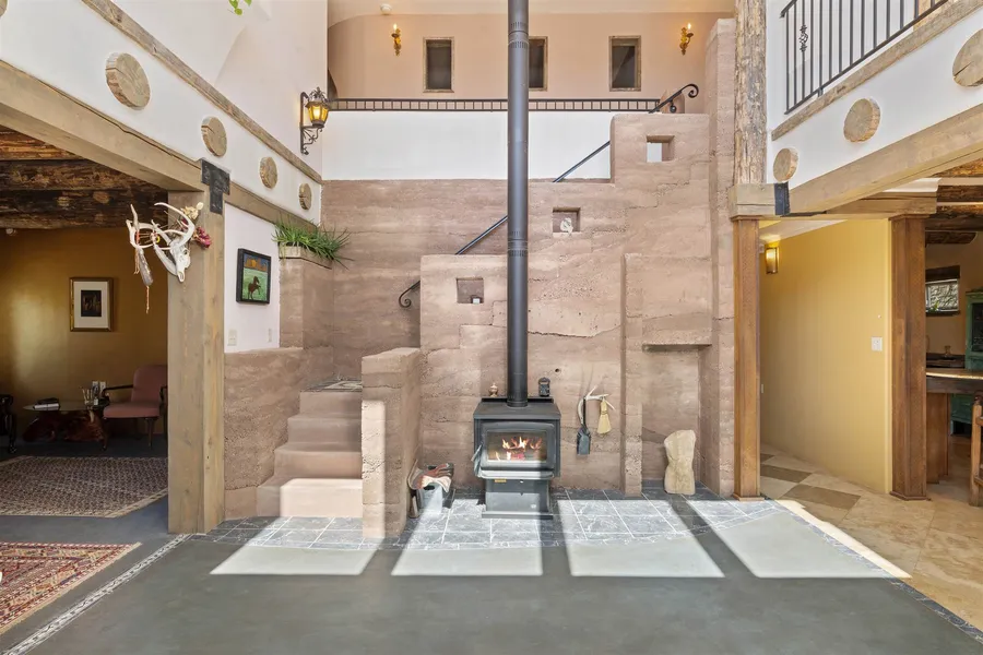 Turn-key, self-sufficiency. Privately situated on 10 acres, this secluded retreat borders the Carson National Forest & El Rito Creek. An engineer-owner-artisan built sustainable home, it offers modern comforts alongside remarkable eco-innovation. At Net Zero, this 2 story passive solar strawbale home has grid-tied solar electric, solar radiant floor heat, wood stoves, rammed earth stairway/thermal mass & earthen floors. Many exquisite recycled & reclaimed materials were used to build the home juxtaposed with artisan diamond plaster finish to create a quiet, esthetically pleasing environment. At the main house, 11,000 gallons of rainwater collect in concrete cisterns and supply the entire house with crystal clear clean water, utilizing a sediment filter & UV Light purifier. A 30 GPM private well augments the main house supply, depending on water usage. The well is powered by a working cla...