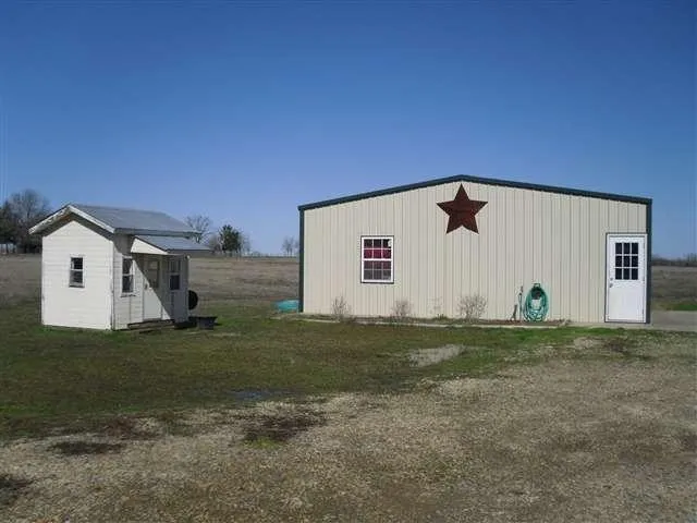 Three bedroom metal home on 10+ acres featuring large open living and kitchen area with painted concrete floors. Two 12ft. overhead doors. Small pond.