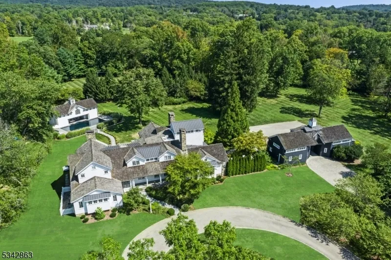 Tucked away in the picturesque landscape of Far Hills, within an hour of NYC, this extraordinary country estate provides an exquisite blend of rustic charm and modern luxury. Set on 10+ gated acres, this private retreat offers natural beauty, architectural excellence, and refined craftsmanship. An extensive 2005 rebuild resulted in a stunning 6-bedroom residence. The spacious home, with two 1st-floor suites for guests, is defined by hand-crafted millwork and hardwoods that adorn the interior. The newly updated chef's kitchen features radiant-heated floors, state-of-the-art appliances, custom cabinetry, and a breakfast bar. The adjacent great room, crowned by soaring hand-hewn beams, serves as the heart of the home, with a floor-to-ceiling stone fireplace and walls of windows that invite in natural light. The primary suite is a serene retreat, complete with a tower office with breathtaking views of the estate's gardens and rolling lawns. The deer-fenced property includes a pool, pool house, tennis court, reflecting pond with fountain and entertainment patios with a hot tub & outdoor kitchen. The carriage house presents a 4-car garage, office, gym, and full bath. This extraordinary home showcases an exterior of fieldstone, hand-split cedar roofing, copper gutters, fieldstone chimneys, and covered porches. Far Hills offers a coveted lifestyle with its equestrian heritage, scenic countryside, world-class golf courses, top-rated schools, fine dining, and access to NJ Transit.