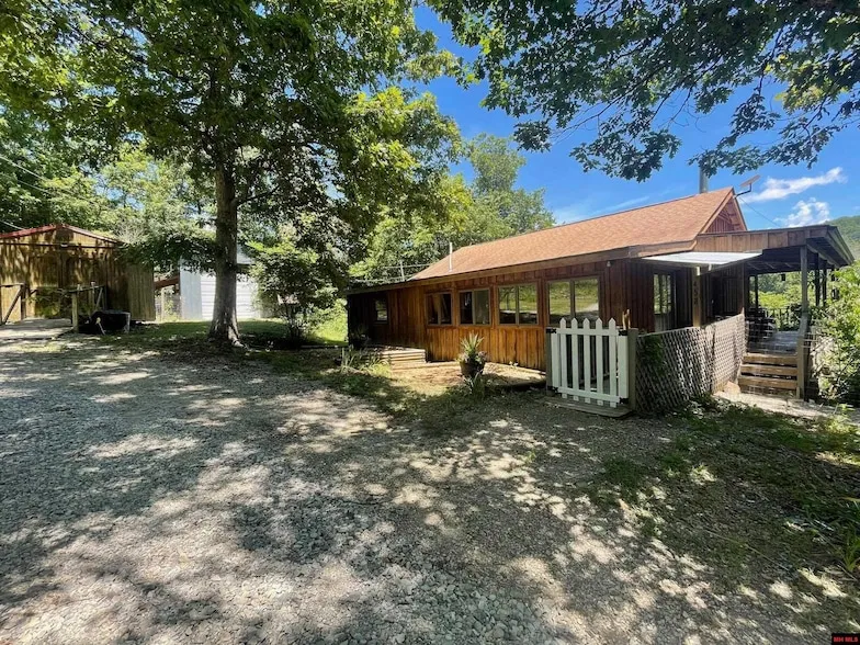 Welcome home to your Ozark oasis on the beautiful George s Creek! This property boasts 10.56 unrestricted acres m/l, a mix of pasture and wooded areas. The home overlooks George s Creek with beautiful views of abundant wildlife. This two bedroom one bath home has 1588 sf, custom tongue and groove wood walls and beautiful pine floors. There is a 20 x 30 shop building with concrete floor, 3 storage sheds, and also a she-shed ready for your imagination!