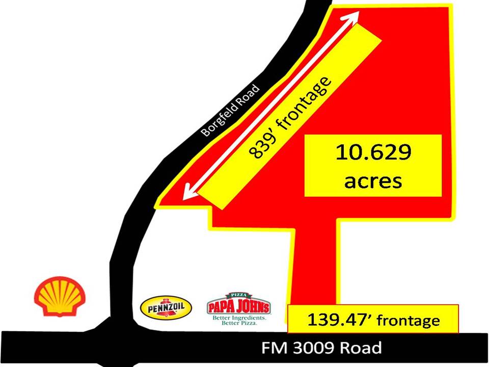 The property has estimated 978’ of frontage (139’ on FM 3009 Road and 839’ on Borgfeld Road) with all utilities already on site.