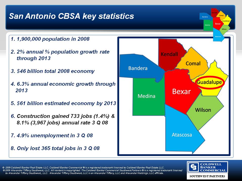 (2) In San Antonio CBSA. The San Antonio CBSA represents an economy approaching $50 billion. It is projected to grow at a robust 6.3% per year through 2013. The population is projected to increase by 2.04% per year, over 100% faster than the US.