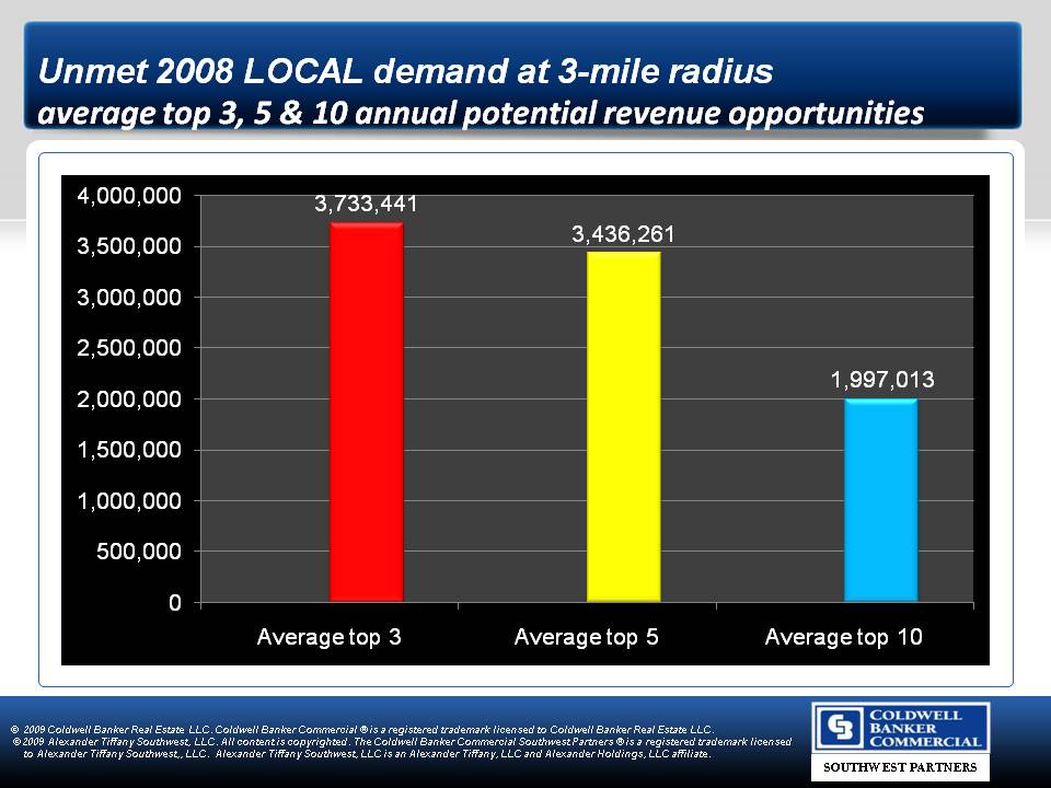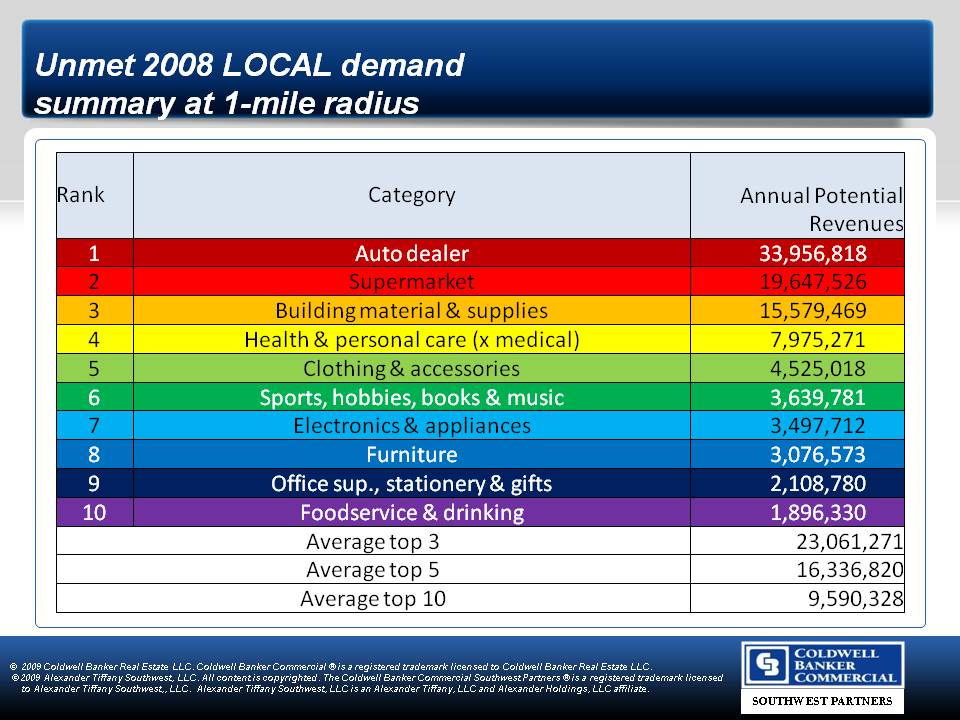(7) At a 1-mile radius, top 3 opportunities to meet unmet local retail demand avg. $23M+, top 5 avg. $16M+ and top 10 avg. $9M+.