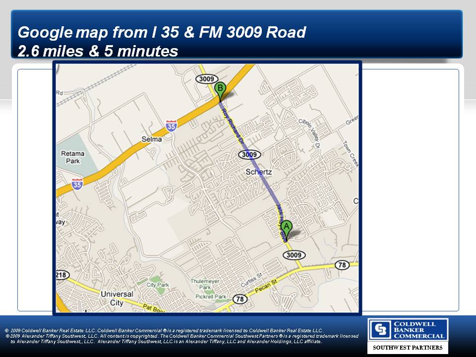 From I 35 and FM 3009 Road, it is 2.6 mi. and about 5 min.