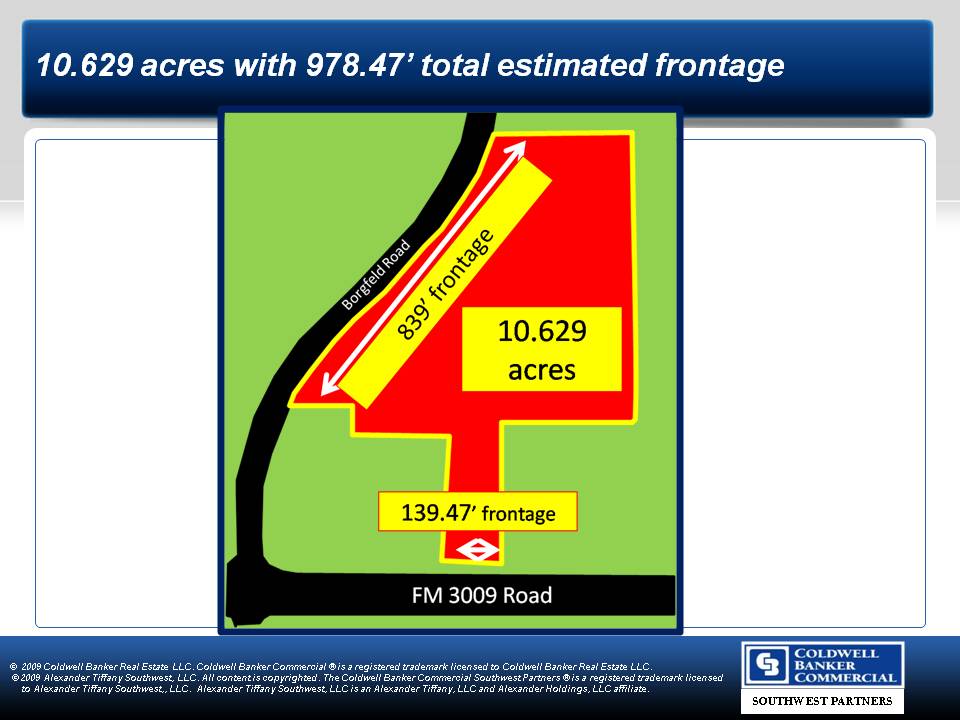 978.47’ of frontage (139’ estimated on FM 3009, and 839.47’ estimated on Borgfeld).