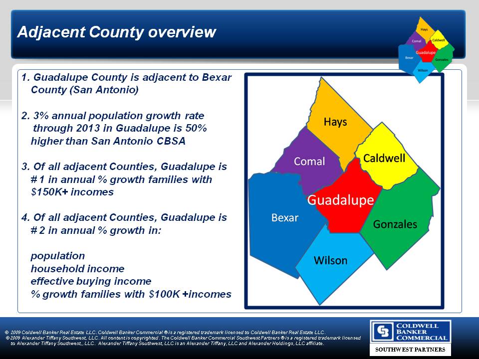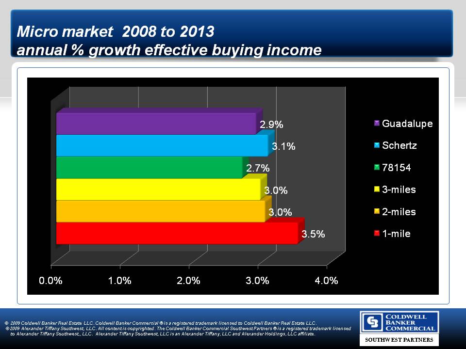 (6) At a 1-mile radius, #1 in annual % population growth, average household income and annual % economic growth compared to Schertz, 78154 zip code, San Antonio, Bexar County, San Antonio CBSA Counties and other Counties adjacent to Guadalupe.