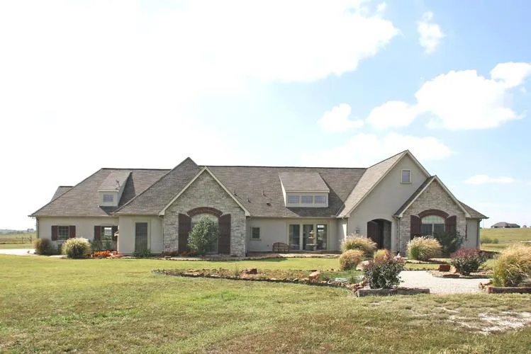 Phenonemal custom built home on 10 acres +/-. Home features 2 Master Suites! One level. Main master has sitting area, office, wine cooler and steam shower! Beautiful feaux painted walls and beamed ceilings! Extremely energy efficient built with 12 inch exterior concrete walls and geothermal heating/cooling system. Massive kitchen with granite countertops, bar and island and pot filler! Large walk-in pantry Stainless appliances all stay! Huge formal dining open to kitchen and living room! Lots of extras including pocket doors, intercom w/ CD Player, tons of built-ins in living room and closets! Large laundry room with sink and storage closets!