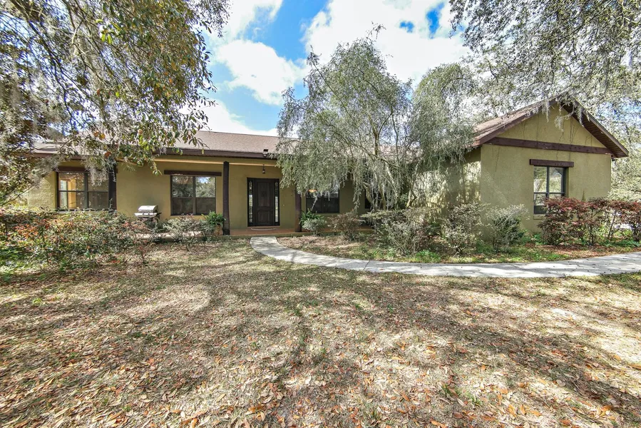 This 10-acre equestrian estate features a meticulously-kept 2004 4/3, 2,849 sq.ft. solar-powered home & 8-stall barn with many cross-fenced paddocks and a wooden round pen, all sitting on 10.42 fenced and cross-fenced majestic Live-Oak lined acres. The custom-built concrete block split-floor plan luxury home boasts a newer solar system powering electric bills less than $10/month. The soaring coffered ceilings, porcelain tile, and three-door slider providing gorgeous views of the natural surroundings will catch your eye! The 16 X 15 open kitchen boasts granite counters, an abundance of solid-wood 42 cabinetry, recessed lighting, all S/S appliances, including a 5-burner Paykel gas range with commercial venting, 2 dishwashers and a double oven. The huge master suite boasts dual walk-in closets, crown moulding, access to the 35 X 12 rear covered lanai, and an abundance of natural lighting from the bay window which provides a beautiful view of the pasture, while the master bath boasts a step-in shower/steam room and granite vanities. Additional features include Dual AC systems (one new in 2017), full level of storage above garage, 30R insulation, Nest thermostats, a 12 well, 30-amp RV hookup and 8 doors throughout. The 8-stall barn with concrete aisle way includes, 12' X 12' stalls with Stallskin flooring, tack and feed rooms, covered wash racks, paddocks for each stall with access to 6 separate pastures that provide plenty of grazing and are protected by no-climb fencing. One of the paddocks can double as a dressage or riding arena. Solar system has independent panels and was installed in 2017. All measurements are approximate and should be independently verified.