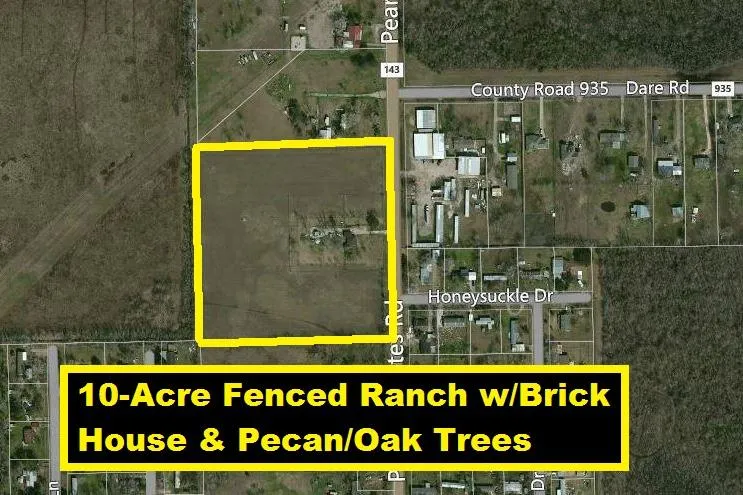 Great Price! 10 Acre Ranch on CR 143 w/Well near TX-35 & CR 128. Mature Pecan & Oak Trees! Property has 2 metal carports (18x24 & 18x32) & shed. Being sold "As-Is" for Lot Value Only! Home has foundation problems. Seller will make no repairs. Bring your investors/builders. Room sizes are approximate. Pearland ETJ. Close to Pearland Recreation Center & Natatorium. Minutes to Hwy 6, Hwy 35, Hwy 288, 2 Hospitals, 2 Community Colleges, Hobby Airport, Pearland Town Center & Baybrook Mall. Many routes to Downtown Houston, Texas Medical Center & Galveston Beach via I-45, TX-6, BW-8, TX-288 & Pearland Pky. Can Be Commercial! Perfect for commercial warehouses, boat/truck/RV storage, multifamily or single family home development. Low taxes! No HOA Fees!