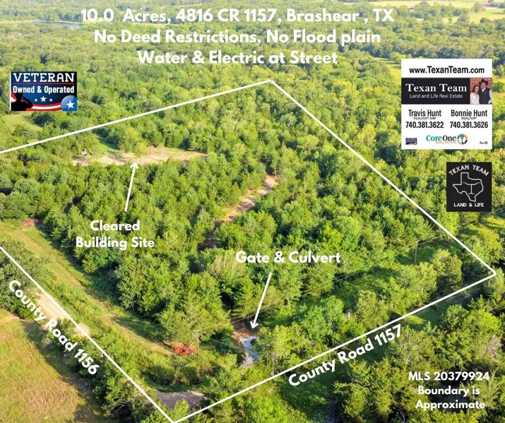 Drone images and video will be posted Sunday July 17th. This 10 acre tract is perfectly positioned, close to Interstate 30, and minutes to Sulphur Springs in Hopkins County, TX USA. Water and electric are at the street, plus an temporary power pole and meter is already installed but not connected. The tract is a corner lot and features about 615 feet of frontage on CR 1157 and about 710 feet of frontage on CR 1156. A culvert and gate have been installed and approximately an acre home site has been cleared. All you need is your barndo or new home plans. There is no flood plain and no deed restrictions. If your not ready to build, no problem, bring your RV and tree stand and enjoy watching the whitetail deer. Hopkins Country is a destination of choice for reasonable taxes and embracing the best of Texas. Information is deemed reliable but buyer should perform due diligence. Shirley water has Water line along road. FEC electric has electric line on east side of property. Please note that an electric easement. Boundary graphic is approximate.