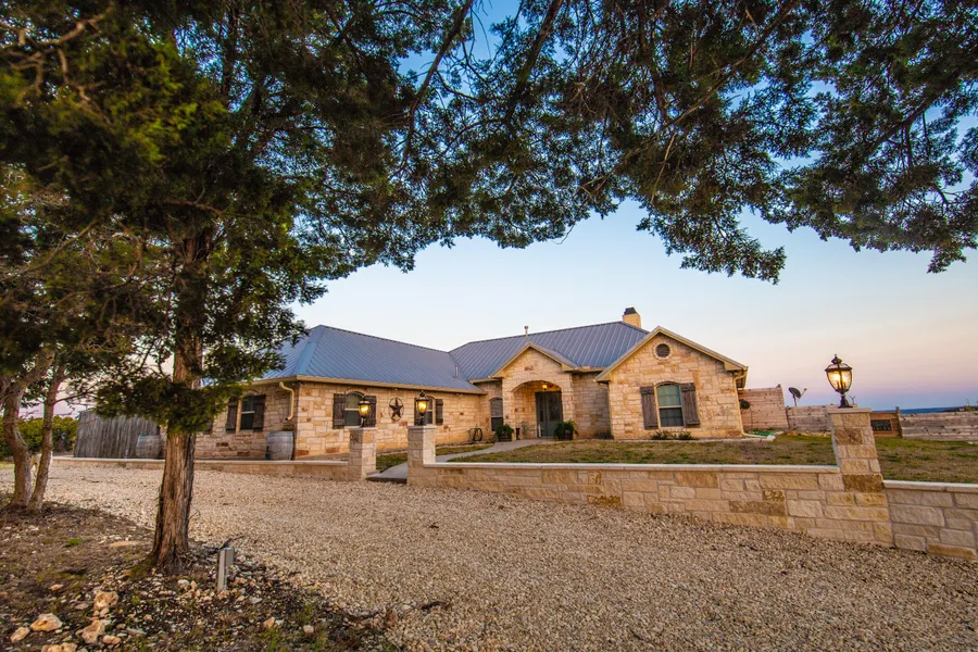 The custom built house is 2627 sq. ft. built in 2006 with stone exterior and metal roof. The house is 3-bedroom/2.5 baths with two large living rooms, and open concept kitchen and dining room. The master bedroom is off the kitchen and the other guest rooms are off the formal living area with a shared bathroom. You enter the formal living space from the front door or back patio; this space contains the kitchen and dining room and has a gas fireplace. The living room has vaulted ceilings accented with cedar wood beam. The kitchen is great for entertaining with stainless steel appliances, tile countertops, and a large island that has granite for prepping food or buffet area. There is ample storage with custom built cabinetry. The home has scored and stained concrete floors throughout. There is a 2nd large living space with bath that leads to the carport. The master bedroom is spacious with large bathroom with walk-in shower, large master closet, enclosed toilet area and two vanity sinks.