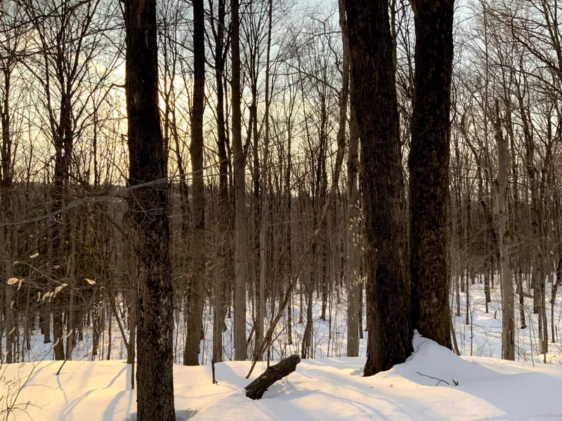 Secluded land with seasonal road access which serves as a snowmobile trail in the winter. The land has a good mixture of apple thickets, virgin mixed hardwoods (maple, cherry, ash), and loaded with turkey and deer. Land is level with the road and then has a mild up hill slope where it plateaus. There is a 12 x 16 unfinished camp that overlooks a downhill grade into the woodlands and distant hillsides. Camp is about halfway in and would make an incredible deer blind as well.
