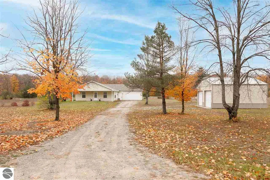 A stick built house, with two bedrooms, two bathrooms, a huge kitchen, gas fireplace, attached two car garage, two pole barns, and on ten acres for under $250,000?!?! YES!! The large island kitchen with tons of storage, is open to the dining and living room, for that open concept feel. Sprawling master bedroom, with a huge private bathroom, and walk-in closet. Outside offers two pole barns. One is 24x24 with power, and two 11x8.5 overhead doors. The second pole barn offers access from S. Weldon Road, 24x30 in size, with two overhead doors (7x9 and 6x8). Electric heat offers a benefit for allergy sufferers. Electric costs average $200/month in the winter. You could also use the gas fireplace to keep the living, dining and kitchen warm and cozy. Home is very well insulated, with the air conditioner rarely needed in the hot summer months. Centrally located with Crystal Mountain being a 10 mile drive, Benzonia is 7 miles, and Chums Corner is 18 miles. This move-in ready, main floor living home with room to roam is not to be missed.