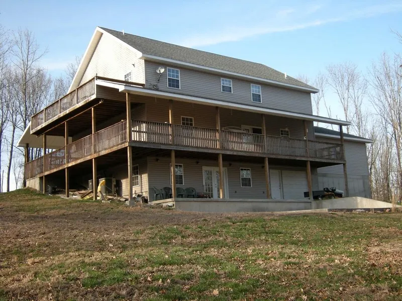 This 5(6) BR, 4 BA custom built home is situated in a quite neighborhood just east of Steelville on 10 acres m/l. This 4050 sq ft m/l (per county records) home was built in 2006. The 2 story home has a full partially finished walk out basement, 2 car oversized attached garage, upper & lower wrap around decks, covered porch & plenty of room for the future. The large kitchen has custom built cabinets, granite counter tops, tile flooring, double pantry & all the amenities you would expect. The entrance foyer and formal dining room have hard wood floors. Master bedroom suite opens onto private deck and includes a large sitting room, double sinks, jetted tub in bath, shower and walk in closets. Downstairs you will find a large game room, another large bedroom, full bath, large workshop with 7'x9' overhead door. The home has dual heat pumps with central HVAC system and it is well built wit...
