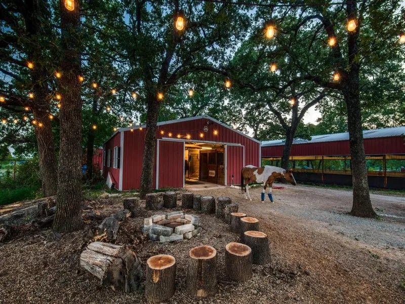 Come experience this beautiful 10 acre horse property in Aubrey. So much to love. Over 100 oak trees, sandy loam soil, 165x65 covered arena, 4 stall barn with tack and feed rooms, 3 stall shed row with hay room, 3 pastures,3 paddocks, 2 run in shelters, 1 pond, workshop, storage shed, Tiny house for Airbnb rental with current monthly income of $1500, deep well and city water, 2 septic systems 1 for house and 1 for tiny house, pipe and cable cross fenced, private road from 428, currently charge $560 per month to pasture board horses. AG Exempt! House provides four bedrooms plus office and four and one half bathrooms. Kitchen opens to large living and dining rooms with vaulted ceiling amazing windows and fireplace. Water filtration system for main house. Filtration system for entire property. Chicken coop and garden area. Come experience this magical property! DON'T USE GPS!