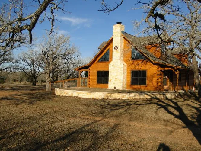 This new, never lived in, Texas style log home is highlighted by scored concrete floors and vaulted spruce ceilings. It has an Austin stone, wood-burning fireplace. There are five matching Austin stone pillars accented with sconces located downstairs. There is a lot of natural sunlight that enters through the many big, beautiful windows. The kitchen has custom cabinetry, granite countertops and a tile backsplash. The bathrooms have the matching granite countertops and the showers are tiled throughout. An eye-catcher in this extraordinary log home is the unique staircase. The owner designed it himself. It is constructed of wood and iron.