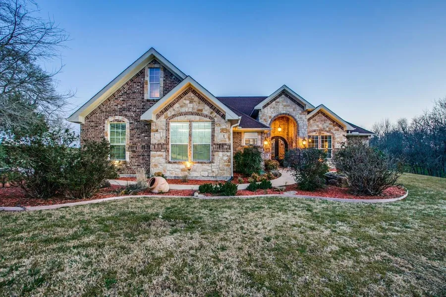 Situated on 10 acres in Leonard, Texas, is a custom finished three bedroom home. As you walk in through the iron front door, you immediately notice the details of oversized baseboards, barn doors, granite countertops, trey ceilings, arched doorways, stained concrete and wood-look ceramic tile flooring. A cozy wood and gas fireplace greets you in the living area. It is an open concept - updated kitchen with a large island, granite countertops, wine cooler, and an oversized walk-in pantry. There are custom upgrades throughout, built-ins in every closet, a Bose sound system, remodeled master bathroom with a large cultured marble garden tub. Upstairs there is a "bonus room" that is great for an office, craft room, play room or easy conversion into a 4th bedroom. This unique home has an all-metal frame, a tankless water heater, smart thermostat, and is energy efficient with spray ...