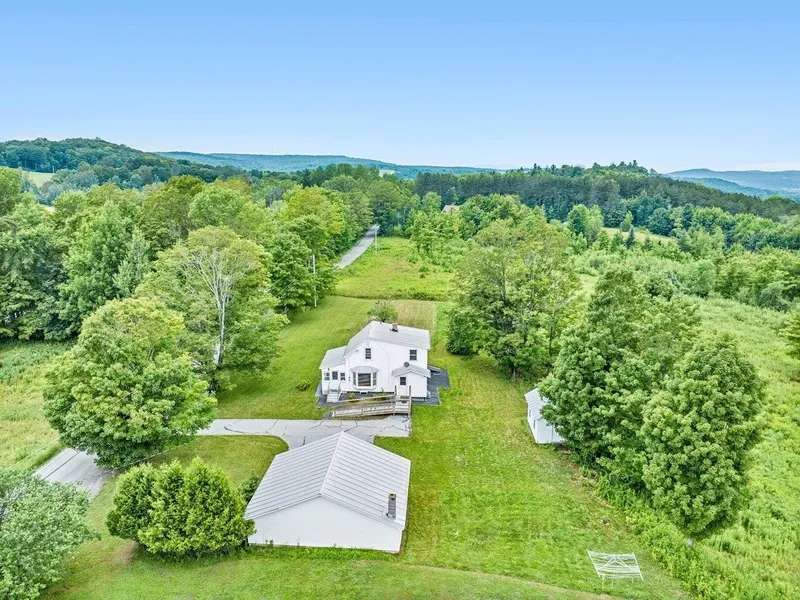 Very cute and cozy home on a sunny road in a beautiful country setting. The large eat-in kitchen has a big picture window looking out toward the open lawn and pretty, wooded area that borders the stream. Tons of counter space and many solid wood cabinets make this a great kitchen! Current owners installed new wood flooring in the living room and the den or bedroom on the first floor. Mid Century style built-ins are also a nice touch in these two rooms. A three-season porch is the perfect place for morning coffee on rainy days. Convenient 3/4 and full bathrooms on both first and second floors. Upstairs are two bedrooms with a bathroom at the top of the stairs. The two-car detached garage has extra room for storage or a workspace. The shed is also handy for storage. All the buildings have standing seam roofs! The sparkling clear water spring is the border on the back side of this property ...