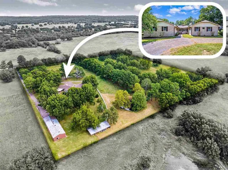 Imagine a life where the "scenic route" is the walk to the mailbox. Where the view out every window is nothing but trees, peace, and tranquility. Such is the case here at Hoe and Hope Farm - a sprawling 10 acre property filled with harvest pecan trees, tulips, daffodils, roses, pine trees, fruit trees, outbuildings, a pond, and a 2400 sqft home to call your own. THE HOUSE: 4 bedrooms, 2 1/2 bathrooms, 2 living areas, and a sunroom. Features a "mother-in-law" layout where the spacious primary suite has a separate entrance and enough room for its own seating area. The kitchen was renovated in 2021, including granite countertops, stainless steel appliances, a Kohler farm sink, and dimmable under cabinet lighting. Brand new roof and gutters in 2025, as well as new carpet and updated engineered hardwood throughout. Other highlights include: cedar-lined closets, plantation shutters, dual-zoned HVAC system, two-car garage with a water softener system, two-car carport (plus another at the workshop), 250 gallon propane tank for fireplace and wall heaters (backup for storms), stackable washer and dryer that stay, asphalt driveway to the house and workshop, and more. THE LAND: a 10-acre square-shaped lot with mature pecan trees (mix of native and hybrid Stewart soft shell), a spring-fed pond, fruit-bearing trees (Bradford pear, plum, cherry, apricot, and green apple), and Bermuda/native grasses that can produce up to 1,500 60-lb. square bales of hay per year. The 3 acres near the house are separated with a 4-rail white vinyl fence, and the property is surrounded by 6-strand barbed wire fence. THE OUTBUILDINGS: 1400 sqft workshop with electricity, cement floor, and an attached two-car carport. Separate barn near the back of the property with four stalls and a large enclosed chicken coop in the center. Children's play area near the house includes a small playhouse, sandbox, horseshoe pit, 2 slides, and a tire swing. TO SCHEDULE A TOUR: If you want to own this slice of Heaven, just give Heaven a call! Contact listing agent Heaven Speirs at 580-713-9494, or reach out to your dedicated buyer representative for more information.